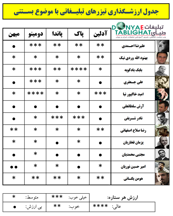 دنیای تبلیغات- امیرحسین نوریان- این بخش دنیای تبلیغات با استقبال بسیاری در بین دوستان و مخاطبان حرفه ای و آژانس های تبلیغاتی مواجه شده است. (برای دیدن ارزشگذاری قبلی اینجا را کلیک کنید) بخش های جدید دیگری نیز به زودی ارائه می شوند. مثلا عینا این نوع ارزشگذاری برای تبلیغات محیطی هم منتشر خواهد شد. یا بزرگترین بانک اطلاعاتی دست اندرکاران تبلیغات ایران نیز بر روی این سایت قرار خواهد گرفت. (از کلیه دست اندرکارن تبلیغات ایران دعوت می شود مشخصات، نوع فعالیت، تصویر، سوابق و… را به همراه شماره تماس و ایمیل خود به info@donyaetablighat.com یا ah_noorian@yahoo.com بفرستند).