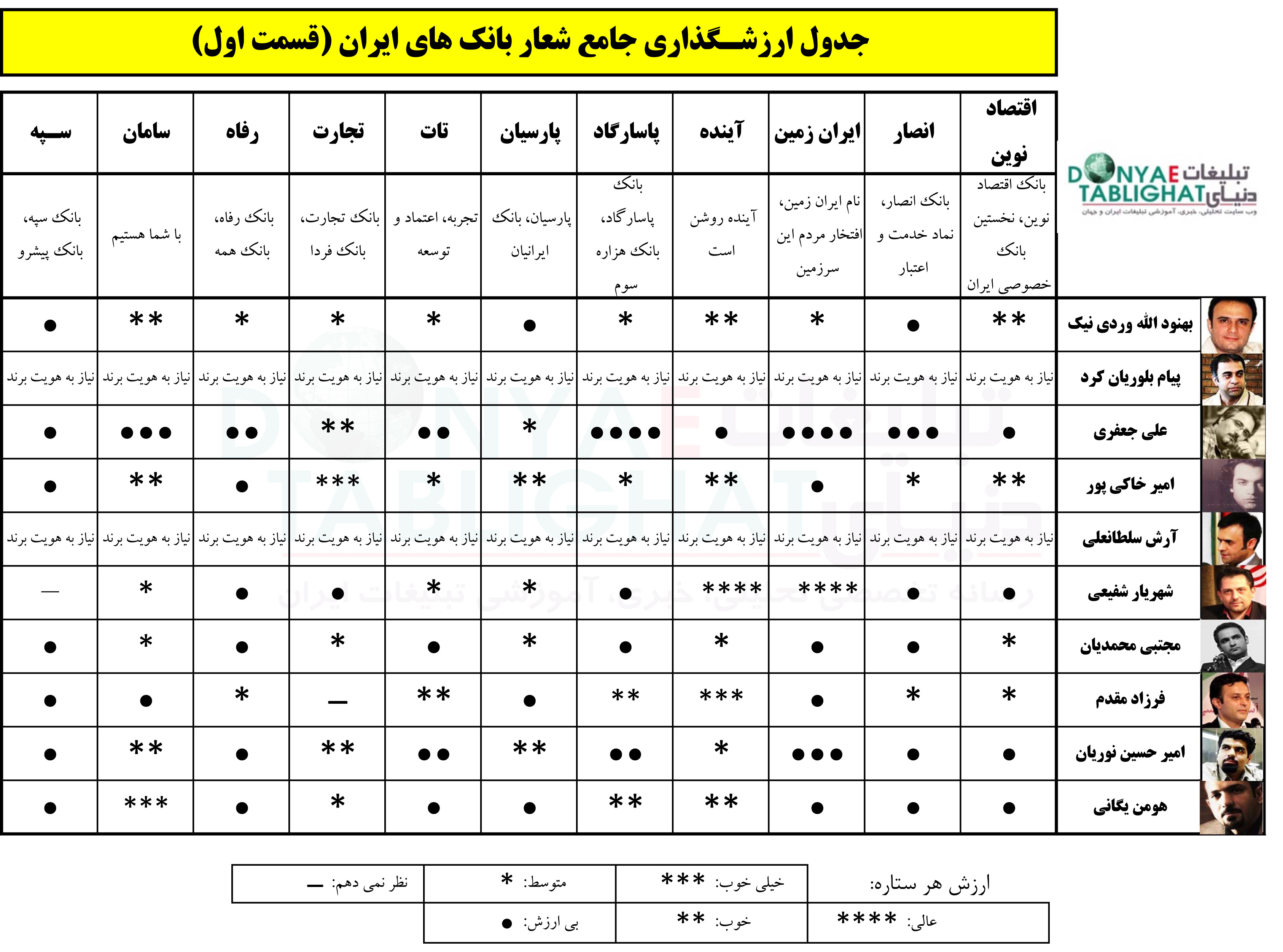 اطلاعاتی که به این بزرگان داده شد از روی عمد فقط شعار بانک ها بدون دادن اطلاعات دیگر بود که برخی از دوستان تقاضای بررسی شعار از لایه پایین تری را با عنایت به هویت برند و میزان تطابقش با آن را داشتند که اتفاقا قصد بر این بود ارزشگذاری با هویت درک شده از سوی مخاطب مقایسه شود. همچنین از میان شعارهایی که بانک های طی زمان های مختلف استفاده کرده اند سعی شد که بهترین شعار بررسی شود نه صرفا آخرین شعار. در این ارزشگذاری شعارهای بیست و یک بانک ارزشگذاری و نقد شده که بدلیل حجم زیاد مطالب در دو بخش ارائه خواهد شد. اولین روزی که ارزشگذاری ستاره ای برای تیزرهای تبلیغاتی را آغاز نمودم با حجم زیادی از سوالات و کامنت های منتقدین و کارشناسان دعوت شده مواجه شدم. در اولین سری این اقدام برای شعار های تبلیغاتی نیز در حجمی کمتر علامت سوالاتی برای همکارانم وجود دارد که اتفاق خوبی است. به زودی نقد لوگو ها، بیلبودها و … رانیز به این شیوه در دنیای تبلیغات آغاز خواهیم کرد. هر قسمت از این ارزشگذاری ها برای علاقمندان به نقد تبلیغات و خود من کلاس درس است. نظرات و زاویه نگاه های متفاوت و تحلیل های جالب دوستان جذاب و خواندنی است. نقد ها را بخوانید و سوالاتتان را از کارشناسان بپرسید و نظر خود را بگویید. شما هم در بخش کامنت هاستاره دهید.