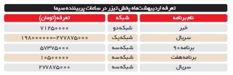 به نظر میرسد رویکرد جدیدی که برای تبلیغات فیلمها در شبکههای ماهوارهای از سمت سینماگران در نظر گرفته شده میتواند تأثیر بهتری در دیدهشدن فیلم بگذارد، اما باید دید این روند تا کجا و چگونه ادامه خواهد داشت؟ نگاهی به تعرفه تلویزیون در پخش تیزر در برخی از پربینندهترین ساعات نشان میدهد انتخاب تیزرهای ماهوارهای از سوی فیلمسازان ایرانی بیدلیل نیست. برای مثال، قیمت تعرفه اردیبهشتماه پخش یک تیزر سه ثانیهای قبل از سریال شبکه یک سیما، چیزی نزدیک به ٢٧ میلیون تومان برآورد شده است یا پخش تیزر پیش از برنامه «٩٠»، ۵٧ میلیون تومان در نظر گرفته شده است.
