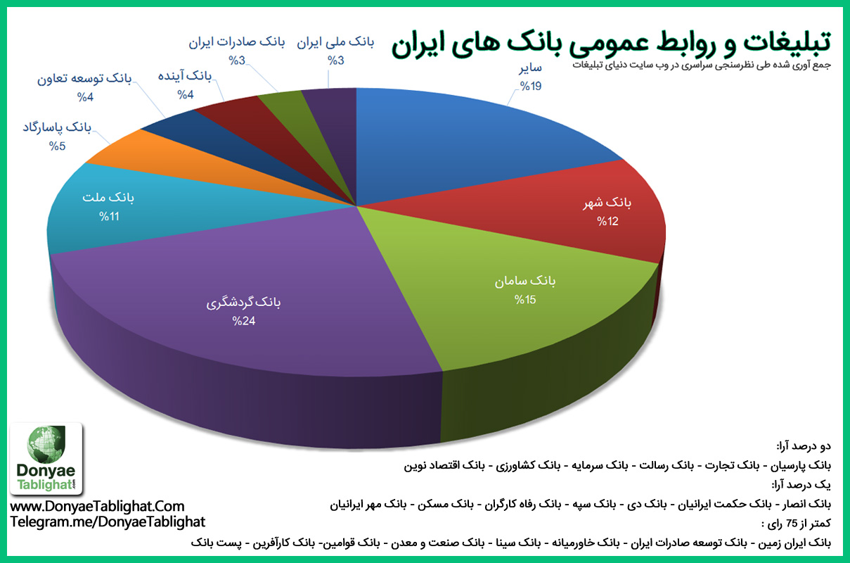 دنیای تبلیغات- واحد خبر– نظرسنجی مردمی با عنوان: به نظر شما “موثرترین فعالیت های تبلیغاتی و روابط عمومی بانک ها طی سه سال گذشته مربوط به کدام بانک بوده” از ۲۷ فروردین تا ۱۰ اردیبهشت در وب سایت دنیای تبلیغات، رسانه تخصصی تبلیغات و برند ایران برگزار شد. در این نظر سنجی که بیش از ۷۵۰۰ رای ثبت گردید، هر شرکت کننده می توانست ۱ تا ۳ بانک را از میان ۳۰ بانک ایران انتخاب نماید که در نهایت بانک گردشگری موفق شد با کسب ۲۴ درصد، موثرترین تبلیغات و فعالیت های روابط عمومی را طی سه سال گذشته از نظر مردم داشته باشد. نتایج نظر سنجی بصورت آنلان در طول نظر سنجی نیز قابل رویت بود.